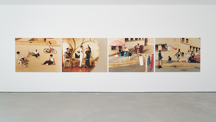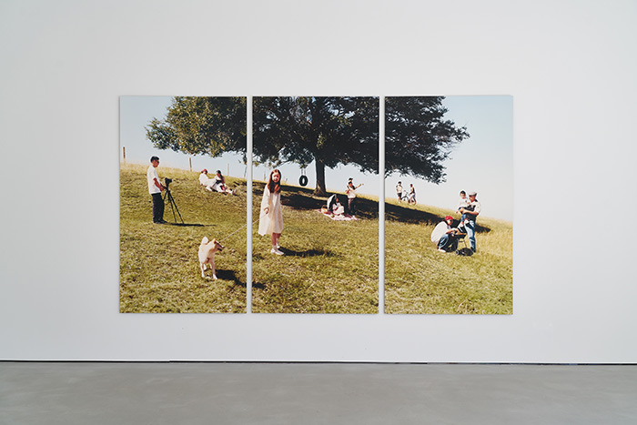 在為此次展覽創作的最新作品中,馬海倫突破了大眾對新疆傳統文化的固有印象,將鏡頭轉向未曾被關注的當代中產家庭生活場景。她受到三聯畫敘事風格的啟發,記錄了一次“夏日野餐”的尋常瞬間。通過精心設計的場景和人物互動,日常生活與虛構敘事的融合營造出一種偽紀實感,也為觀眾帶來了觀看新疆的另一種視角。