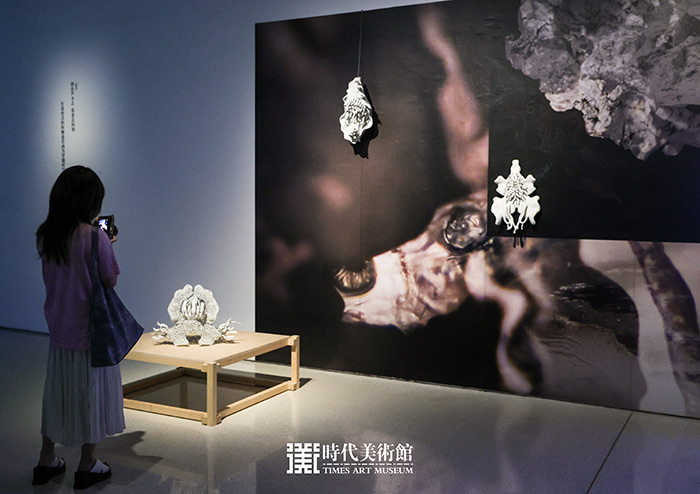 你也許會被跨越時空的生命所震撼:曹舒怡的3D打印樹脂雕塑《潛含親緣》呈現了跨越時空與生命形式的蛻變——無脊椎動物的逆行蛻變、由微生物粘液組成的鐘乳石、產在粘液石中的昆蟲卵、多物種共生真菌及其代謝產物。藝術家提出了一種人類中心主義以外的邏輯去認知我們的星球。