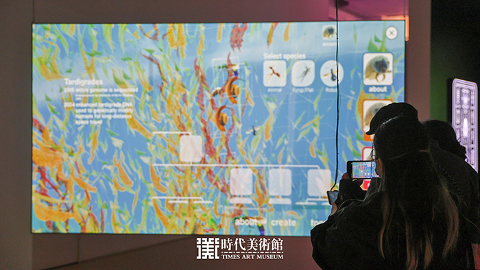 你也可以隨時拿起手機與作品互動:瑞士藝術家馬克·李的《演化推測,原型 1》通過移動應用程序與網絡裝置的結合,邀請觀眾創造新的生物變種,體驗與工程改造物種共存的生態系統,引發我們對未來生物多樣性的深思。藝術家在開幕式的發言中表示:“在科技進步的今天,我們應以更謙遜的態度對待自然,實現人與自然的和諧共生”。