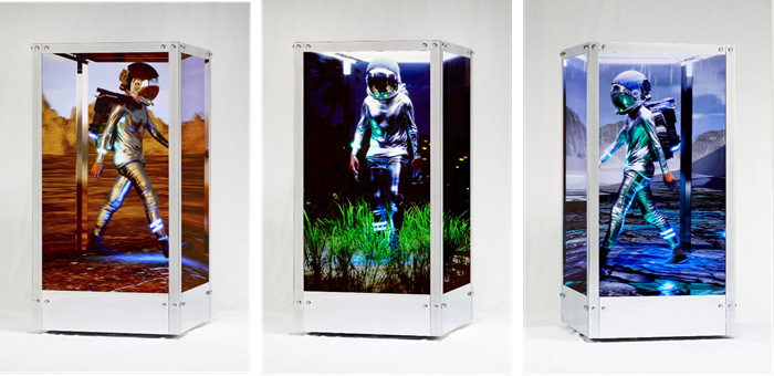 S.2122,Beeple,2023年作,四頻道數碼錄像雕塑(彩色、有聲),拋光鋁金屬外殼,內部薩佩萊木支架,221 × 121.9 × 121.9厘米,?圖片由藝術家提供