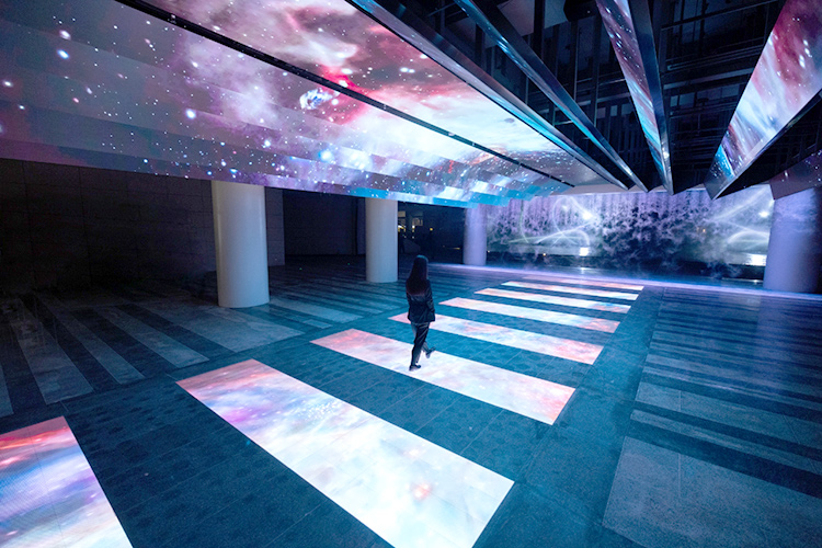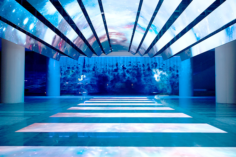 這是一個由20組LED影像構建而成的數字空間,包含11組天空屏和9組地面屏,形成光影交錯、沉浸無邊的“藝術光廳”。
