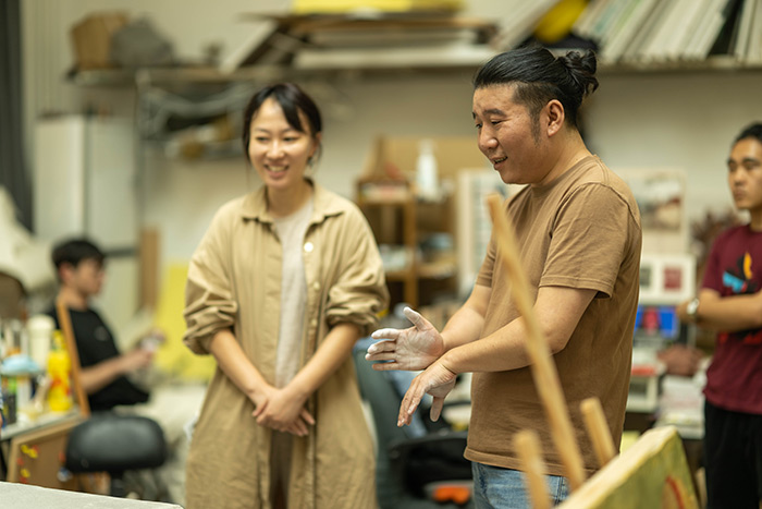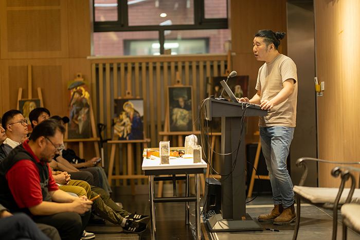 然后是對談環節,宋佳益、范明正趙艷婷、王云曲、王喬浦合就濕壁畫、干壁畫、工筆重彩、蠟畫、坦培拉、混合技法等領域進行了深入探討,并對傳統師徒制、現代藝術教育、跨媒介學科交叉、古典與現當代藝術的關系等諸多話題展開熱烈討論。嘉賓發言如下: