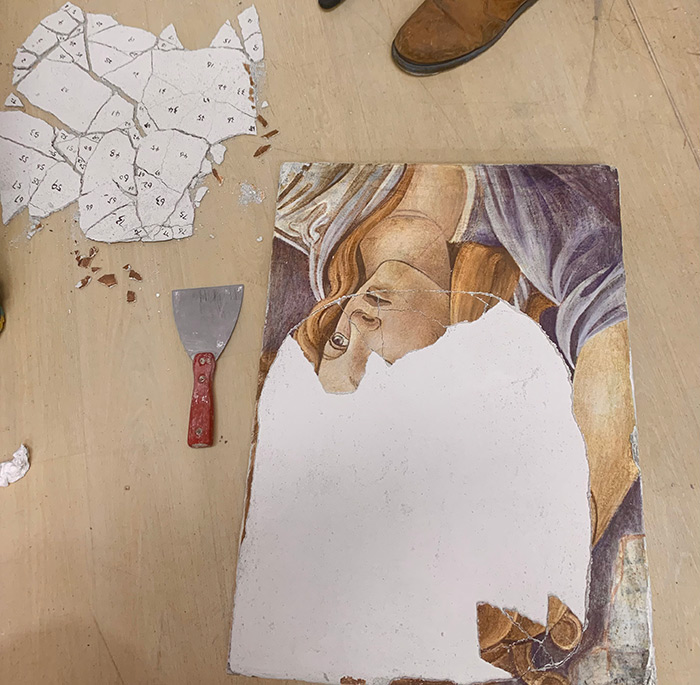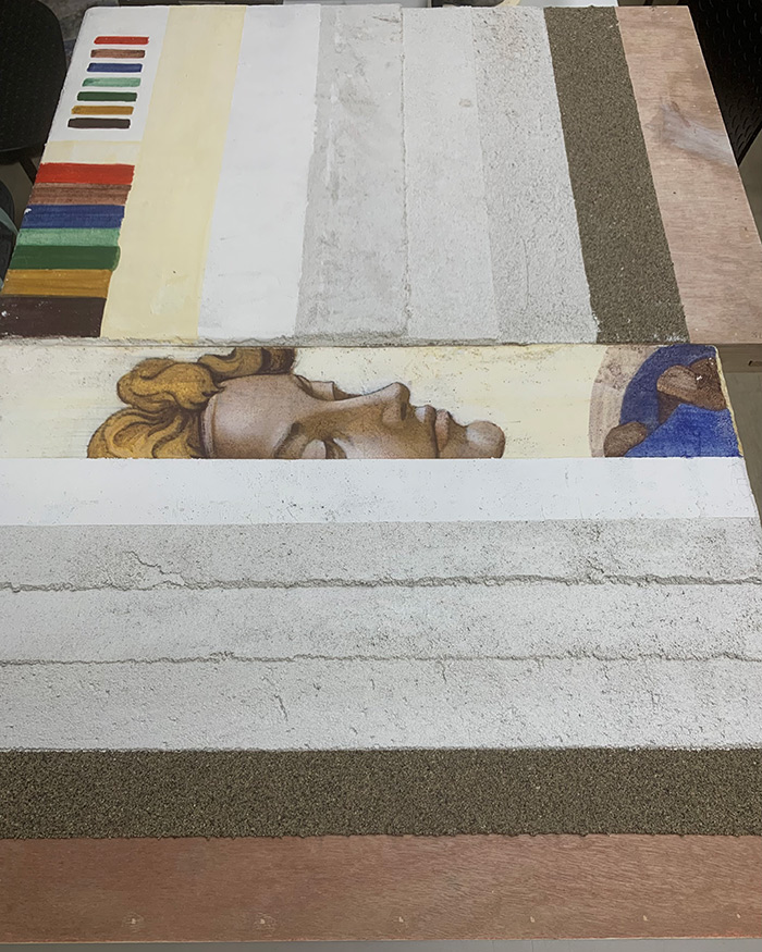很榮幸能夠參加首都師范大學美術學院開展的《歐洲傳統濕壁畫工作坊》專題研討。作為歐洲傳統繪畫的重要組成部分,意大利文藝復興時期的濕壁畫是藝術史中繞不開的研究領域,其概念均已約定俗成,但涉及到實踐及教學環節,則大多莫衷一是。正基于此,首都師范大學美術學院直面經典,通過不斷的探索與調整,最終將濕壁畫引入到教學體系當中來,并通過實踐對其產生全新認知。一方面,濕壁畫的繪制講究程序,其材料與技法乍看繁復,實則精簡,粗獷的畫面效果背后是有條不紊的繪制程序。另一方面,濕壁畫的教學重視傳承,與強調系統性、科學性的現代教學方式相反,工坊制的學習方式更強調手感與經驗的積累,通過不斷打磨彰顯工匠精神。最終通過對傳統繪畫技法的掌握與應用,完成從臨摹到創作的轉化,使其成為未來創作的底色與基石。