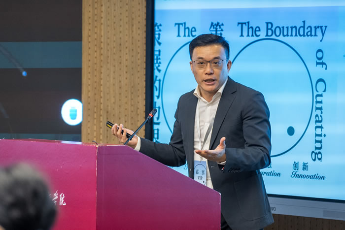 作為唯一一位來自設計學科的教師,中央美術學院設計學院教師,中國科技館學術委員會委員薛天寵博士分享了題為《策展切面——數智時代下的未來探索》的演講。薛天首先介紹了設計學院策展課程的兩個領域:設計策展研究和展覽設計研究。設計策展主要指向理論研究和實踐策劃屬性,而展覽設計更多關注展覽內容為主體,如何塑造展覽空間、流線設定和觀眾體驗。他強調,策展除了技術上的功能需求外,更要考慮作為知識生產方式如何產出有價值的內容。策展人不僅需要在學術上進行研究,還需要具備協調、募資、溝通、規劃等能力,對社會保持敏感度,幫助展覽進行品牌塑造和宣傳傳播。