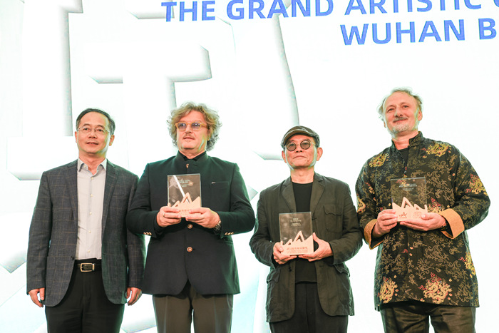 “藝術盛典”現場,藝術家傅中望與意大利藝術家阿爾弗雷德·米拉?!っ茁逄兀ˋlfred Mirashi Milot)、赫利頓·西哈(Helidon Xhixha)獲得“武漢雙年展貢獻獎”榮譽 曾熙來 攝
