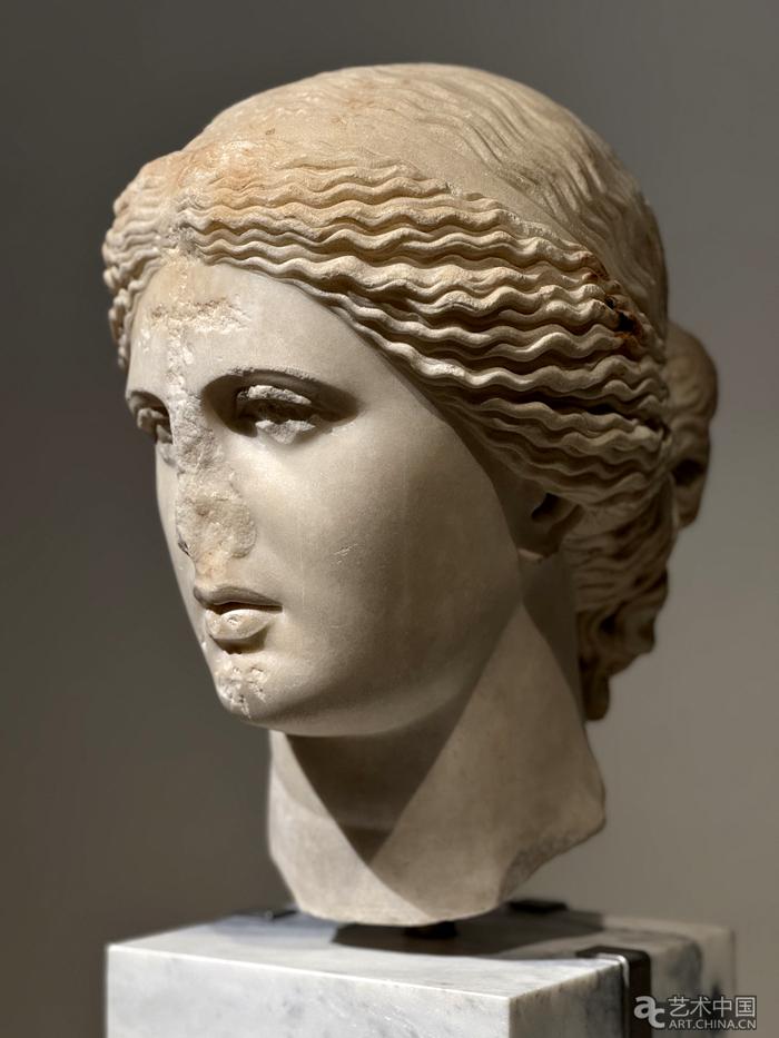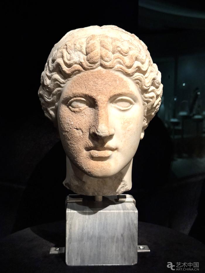 大理石阿佛洛狄忒頭像,來自雅典的古羅馬市集。公元前4世紀原作的羅馬復制品。它復制了著名古典雕塑家普拉克西特列斯的原作。原作的模特是藝術家的伴侶、著名“交際花”芙里尼。頭像的額頭在基督教時代被刻上了十字架。