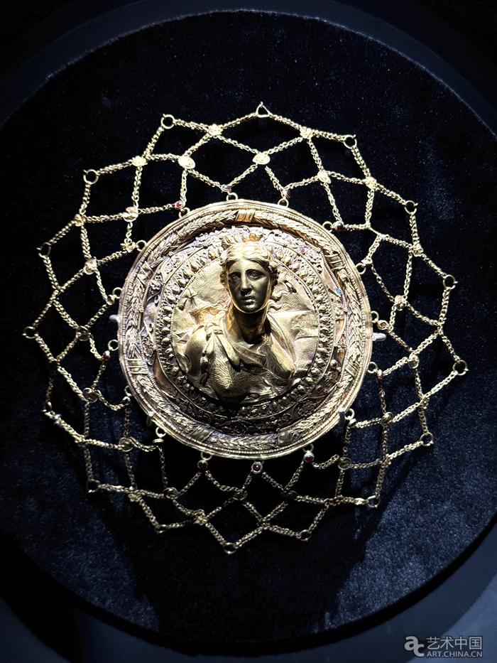 阿爾忒彌斯金鏈網頭飾,公元前4—前3世紀。這件頭飾精致的鏈網鑲嵌有紅寶石和藍琺瑯。中央的圓形裝飾展示了右肩負著箭筒的女神阿爾忒彌斯。