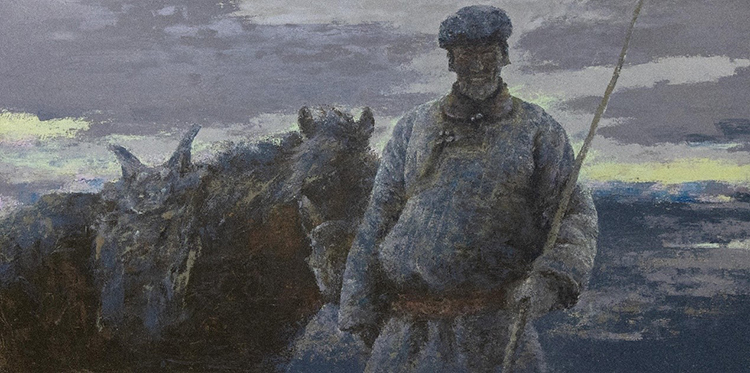 亞江天生有一個長歌的靈魂,其繪畫從長歌中噴涌。噴涌如一場烈火,燃燒自己的心血,映顯出自己的靈魂??此漠?,英雄、男人、女人、母親、少女、小伙兒、駿馬、羔羊……都是他心血烈火中永生的形象,帶著灰蒙蒙的灰燼,風塵仆仆,屹立于蒼天大地,溫暖、平靜、樸厚、真實、自然、雄偉,在黎明和傍晚走向遙遠,走向天邊。