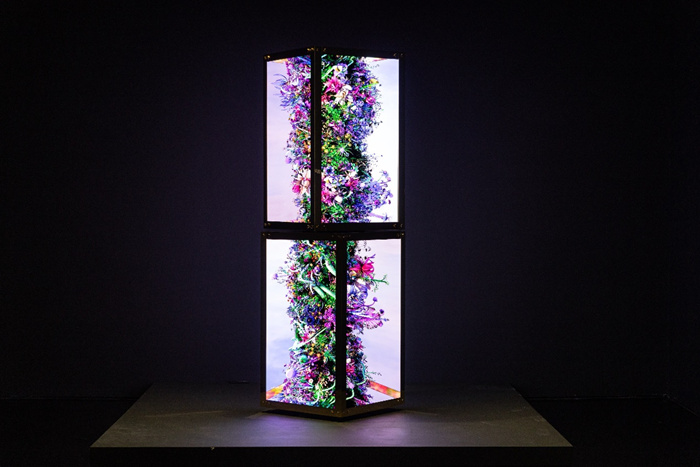 S.2122,Beeple,2023年作,四頻道數碼錄像雕塑(彩色、有聲),拋光鋁金屬外殼,內部薩佩萊木支架,221 × 121.9 × 121.9厘米,?圖片由藝術家提供