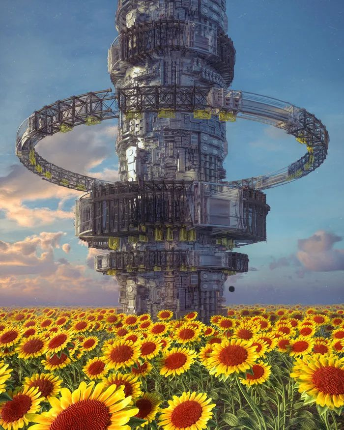 同樣是由時間刻度引發的思考,如果說《每一天》是對于過去發生的創造性記錄,那么《S.2122》則是對未來不確定性的展望。Beeple始終將超現實主義與寫實主義相融合,在“未來”的奇異場景中映射當下的事件,也在現在正在發生的事項中推演即將發生的未知可能性?!禨.2122》采用動態雕塑的形式,通過對現實生態及社會的觀測,以虛擬空間為介質,向觀眾展現了2122年社會圖景的一種可能性。它不僅揭示了氣候問題的緊迫性,也呈現了人類在極端環境下所表現出的堅韌意志和力量。在這個Beelple稱之為“城市街區(city block)”的離散世界里,時而展現出夢幻般的景象,時而又顯露出反烏托邦的面貌。一座座獨立的多單元高層建筑矗立于一望無際的大海上,船只在建筑中穿梭,飛行器在空中盤旋,郁郁蔥蔥的植物附著在高聳入云的建筑之上,身著制服的工作人員往返進出建筑物,井然有序的開展著工作。隨著雕塑的旋轉,時間與季節隨之更迭,景觀亦在不斷變換,共同在這個異乎尋常的結構中持續演變著。這一作品不僅是Beeple對人類技術發展至某一臨界點時的深刻反思,更是對人類社會未來走向的一種啟示,促使我們更加審慎地思考技術進步與生態環境之間的微妙平衡。