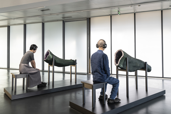 展覽的題眼是“須臾之物” (Transitory Objects)——這也是瑪麗娜·阿布拉莫維奇在專門為藝倉美術館錄制的視頻里強調的概念。須臾到底是什么?在展覽入口播放了一段藝術家為中國觀眾特別錄制的視頻,她說希望我們有足夠的耐心去與這些“須臾之物”相處,它們包括了展廳里那些地質材料、水晶礦石,她希望觀眾能與這些物品互動,進而去感受這些物品與我們產生微妙的鏈接與感應,去體會她在長城上行走時的感受,可能還涵蓋一種抽象意義上時間的流逝。