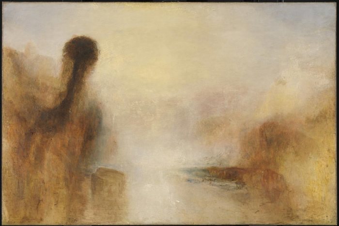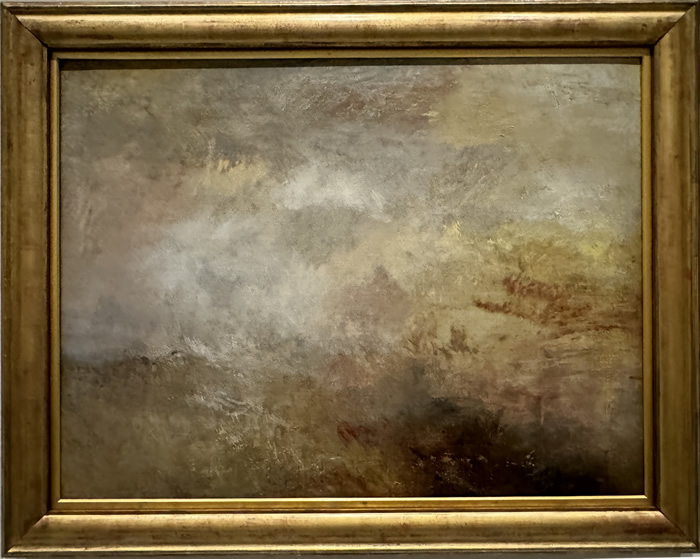 透納的晚期繪畫越來越脫離事物具象形態的束縛,《波濤洶涌的大海與海豚》、《風景與水》等作品展示了透納對光與氛圍的詳盡探索,幾乎完全脫離了具象或地形元素,天地之間只有光與色彩,一片空濛混沌。