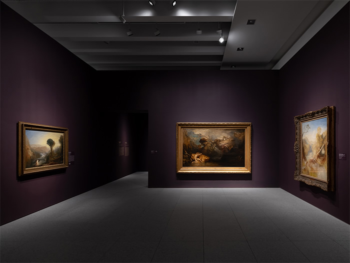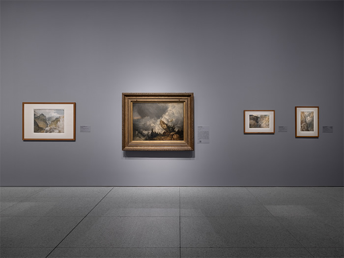 在三樓展廳,通過“始于英國風景”“進入山間”“歷史的崇高”“威尼斯:崇高之城”“海上風暴”“海與天空”“透納晚期:自然的崇高”展示了透納漫長藝術生涯:從青年時期較為嚴謹的學術風景畫,到中年對風景畫大膽革新,由再現推向表現,由靜態轉為動態,在晚年更為激進的實驗風格。