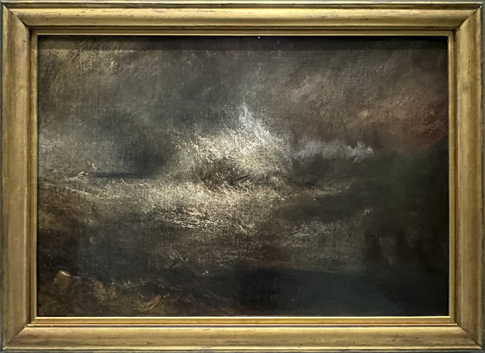 透納經常表現大??植赖拇輾Яα?,透納描繪了很多海難沉船題材,其他藝術家表現同類題材往往是災難前后的時刻。在這幅畫中,透納選擇災難正在發生的夜晚,猛烈的巨浪將船身擊碎,爆裂的浪花中浮現著船只碎屑,慘白的浪花與黑魆魆的大海和天空形成鮮明的視覺沖擊。