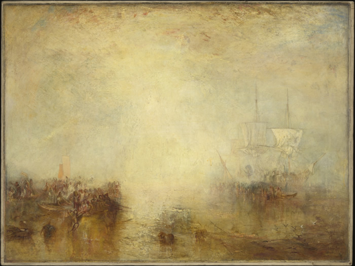 透納筆下的大海變幻莫測,月光下的大海,落日輝映的大海、混沌的云海、暗夜里咆哮的大海、風暴中旋渦翻滾的大?!€有人類在海上的漂泊,捕鯨船、海難和戰爭,大海的不可抗力帶給人類的威脅和恐懼,生命與死亡的交織。