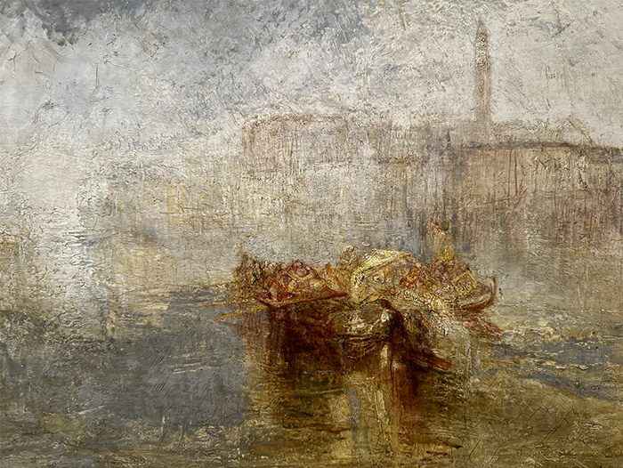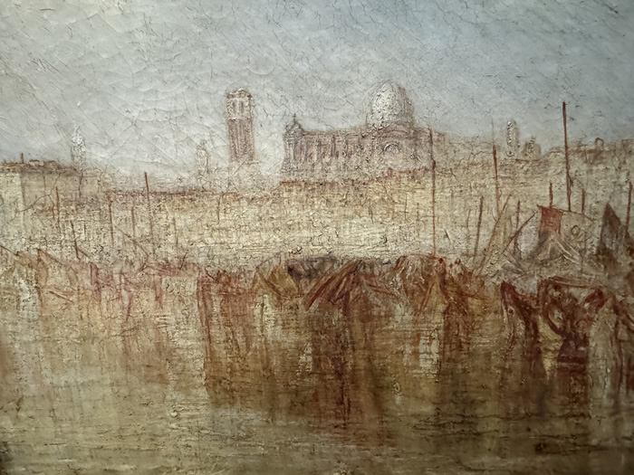 在這幅《威尼斯-午間》中,透納展現了對油畫材料高超的駕馭能力,不僅有光影的豐富層次,也展現出濃郁的油畫物質美感,在一團模糊微小的船影中,用涂、描、點、揉等方式將船只的桅桿、船身輪廓和人物的關鍵細節交代清楚,遠看如同泛著光的琥珀;海面和天空用厚筆疊壓底層,表層用干筆或刮刀刮擦出乳酪般的豐腴質感。