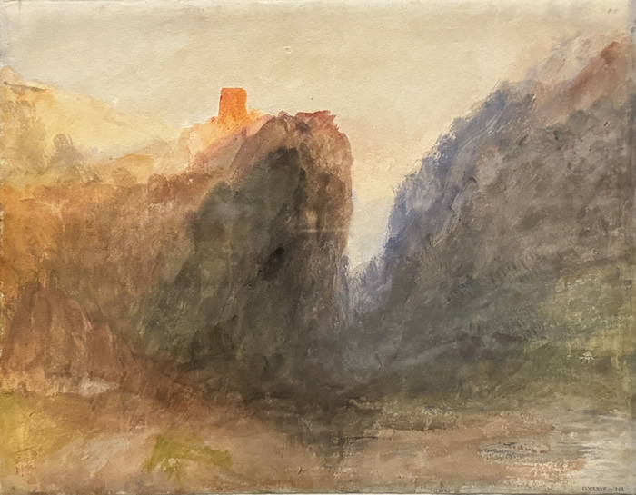 中國人很早就表現出對山的熱愛,但歐洲人在很長時間回避和恐懼山這一主題,到了近代很多探險家和貴族才開始熱衷山區旅游。透納的山地題材非常豐富,尚未被人類馴服的山峰、丘陵、懸崖、峽谷、湖區等都是他熱衷的題材。有些作品中對地形的描繪很精確,如實的展示了該地區粗糲、原始的風貌,另一部分則表現出磅礴的氣勢,險峻的山嵐、孤獨的古堡、強烈的光影,傳達出山體帶給人的險峻、莊嚴、敬畏的心理感受。