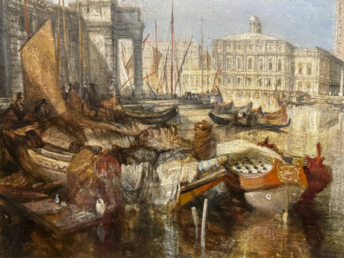 威尼斯是透納的另一座靈感的源泉,這座偉大城市的色彩和悠久的歷史孕育了緹香、委羅內塞等大師,同樣威尼斯輝煌的建筑、璀璨的光線、斑駁的流云、搖曳的剛朵拉船影都深深吸引了透納的目光,他感受到光線和色彩的交融,大氣的彌散,天地貫通的氛圍。他在這里創作了很多作品,他描繪的威尼斯如音樂一般朦朧飄逸,為這座漂浮的城市譜寫了永恒的詩篇。