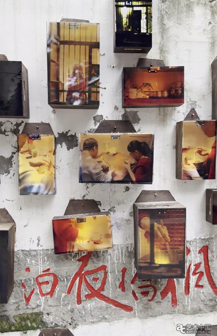 《萬家燈火,一盞歸處》陳設在鐵路三村社區入口的墻壁上,作品是一組以鐵路三村社區居民烹制早餐為主題的裝置攝影作品。主創人員在窗外聚焦于清晨的幽暗中,王阿姨一家在室內烹制早餐和就餐的情景。同時,創作者將攝影圖片鑲嵌在社區居民早期使用的木質郵箱上,鐵路三村的居民很多是外地務工人員,郵箱就是他們對外連接的橋梁。當夜晚居民經過裝置時,箱體中的感應燈就會亮起橘黃色燈光,一幅幅溫馨的家庭就餐畫面就會幽靜的夜色中浮現出來,作品不僅詩意地呈現出鐵路三村社區萬家燈火般的日常生活,也喚起了居民早期生活的集體記憶。