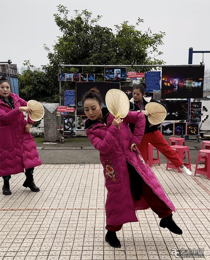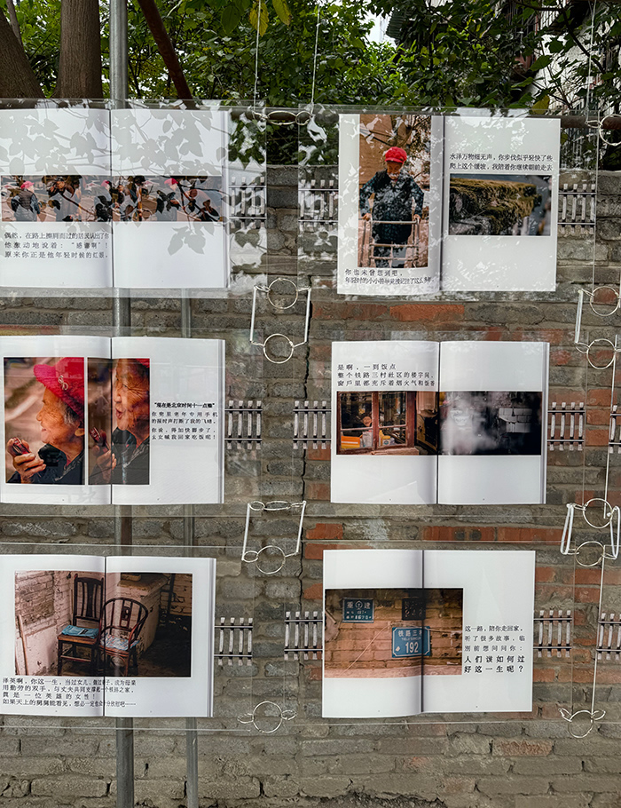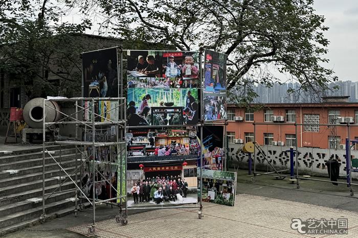 在小廣場的鐵架上展陳著曾令香在酉陽縣花田鄉中心村發起的文化賦能鄉村振興的案例“人民美術講習所”。曾令香向筆者介紹這些鐵架之所以設計成移動式,主要考慮不要將藝術事件作為一種強介入的姿態進入社區