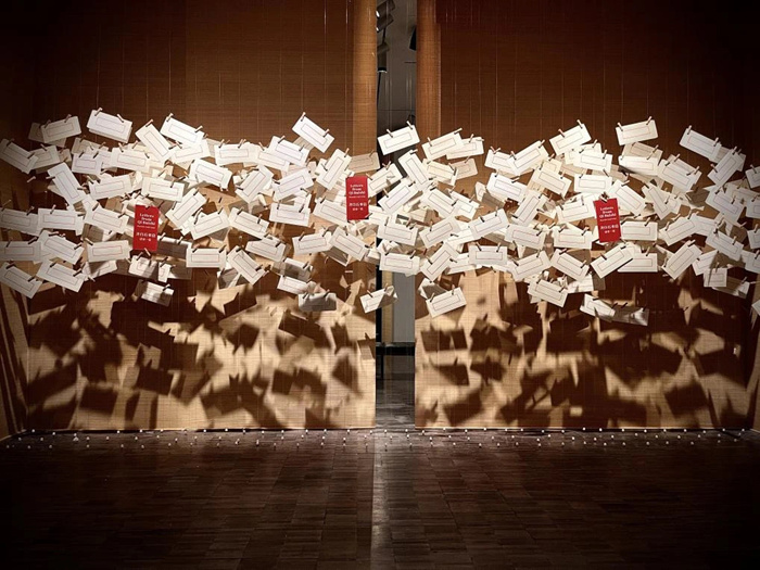 展覽從視覺、聽覺、觸覺等多維度打造了一場富藏北京胡同風情的游覽體驗。展廳入口處,觀眾將邂逅“白石來信”的互動裝置。數百封傳統的中國信封,每一封信中內含一卷白石老人的小畫、詩箋或祝福。它們以縱橫經緯排布的方式,共同編織出一幅靈動的幾何圖案,讓人不禁想起胡同中的窗棱,因縱橫的木質結構、銜接其中的紙面而形成的動態美感。