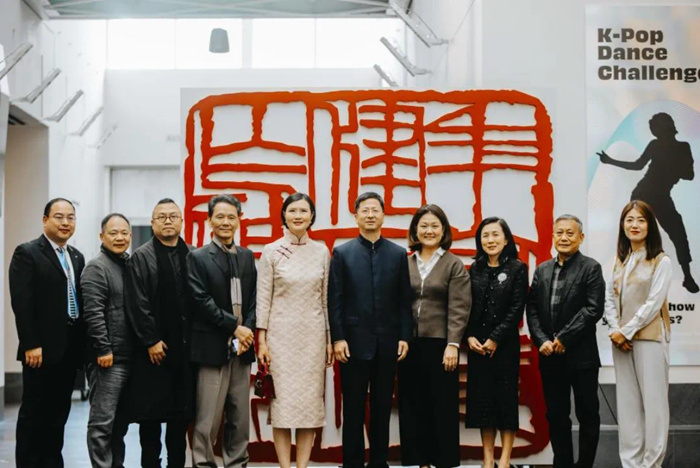 齊白石藝術國際研究中心秘書長王亞楠為中國駐舊金山總領事張建敏及其夫人鄭心介紹展廳作品