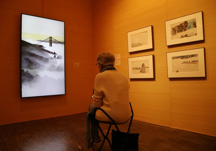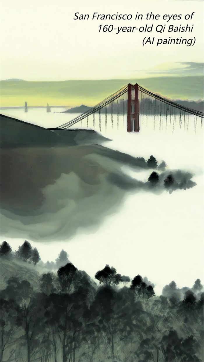 數字影像涵蓋三個單元,包含“寫生與寫意——從真實物像到藝術表達”,以魚的圖像為例展現東西方繪畫中對真實對象的不同表現手法;“筆墨分析”,從齊白石繪畫中的“一筆”為伊始,解析中國畫的水墨在宣紙上舞動力量;“師古人與我有我法”則呈現了計算機模型通過學習齊白石作畫風格,結合AI輔助設計生成的“AI齊白石”圖繪舊金山的影像。