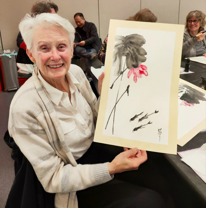 開幕式后,由北京畫院副院長郭寶君受邀為公眾開展中國水墨畫工作坊,舊金山亞洲藝術博物館總策展人Robert Mintz主持,北京畫院展覽編輯杜雨欣翻譯。他以齊白石的《荷花小魚》為例,通過現場示范及講解的方式帶領公眾體驗水墨畫創作。