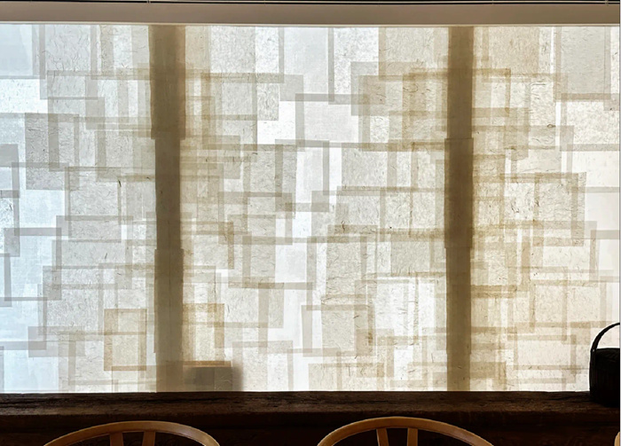 步入展廳,觀眾將置身于竹簾、宣紙共同構成的藝術世界。這些從空中垂落的竹簾,半隱半顯,仿佛是胡同巷子里永遠半敞著的矮門。它們分割了空間,展現出一進一落的胡同結構;傳遞出鄰里之間親密的共生關系。墻面上的宣紙布景,由近十種不同的紙料構成如構樹皮、桑樹皮、云龍宣紙等構成。紙面精細的紋理,起伏的纖維結構,帶領觀眾步入畫家的水墨人生。