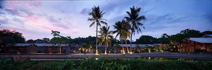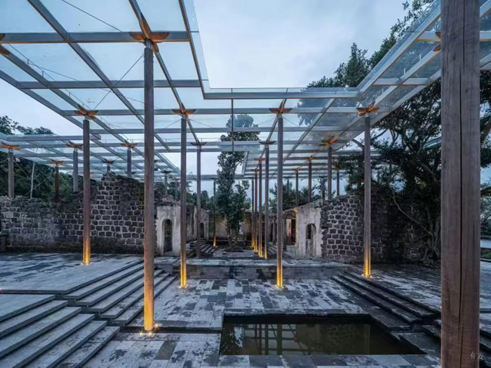 葉曼: 這個項目在龍吉古村,位于瓊北火山巖古村帶澄江邁嶺的龍頭上,村東南角的臺地上的“通德堂”和“將興公祠”為明清建筑,是用火山巖壘砌的,展現了瓊北精湛的石雕、木雕、灰作等建筑工藝。最初我們想修舊如舊,但效果都差強如意。在有限的工期和預算內,難以買到合適的木材,做出一樣的石雕,從而“修舊如初”。后來我們想到以“為老祠堂加冕”的理念,為“通德堂”“將興公祠”兩個祠堂遺址建造一個淺基礎的遺址遮護的構筑物,將祠堂廢墟變成了遺址展廳,保留了祠堂原始風貌和大榕樹,新增的玻璃頂像大傘一樣為遺址遮避雨水,78 根海南名木“坡壘”形成柱陣,由鋼索拉結為一個柔性而穩定的張拉結構體系,可在海島臺風之中守護老祠堂的周全。整個建筑外觀頂部是體現當地精細的玻璃頂,下面是滄桑古老的火山巖老建筑遺址。這仿佛是海南當代文化的寫照——從古樸到現代化的穿越與碰撞。我們認為這個項目是對海南本島“文脈延續與創新”的一次反思與實驗。