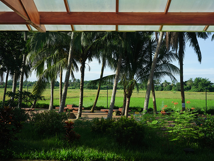 汽車行至那雅村村口時,首先映入眼簾的是圍欄內一群活潑的大白鵝,大鵝的叫聲此起彼伏。路邊田地里大片油亮的辣椒苗正茁壯成長,遠處方綿不絕的樹林勾勒出一派寧靜的田園風光。換乘旅游車深入村中,那雅村的公共活動區的中心是一座古魚塘。湖岸邊幾棵高大的椰樹迎風而立,椰林后方是一片新改造的建筑群,包括會客廳、餐廳、民宿和辦公區域等。其中,高大的會客廳尤為引人注目。它采用榫卯新木結構支撐,纖細的鋼索穿插其間,半透明的陽光板和敞開的落地門設計,讓建筑整體散發出亞熱帶建筑特有的通透與輕盈之美。