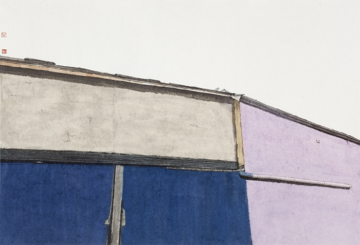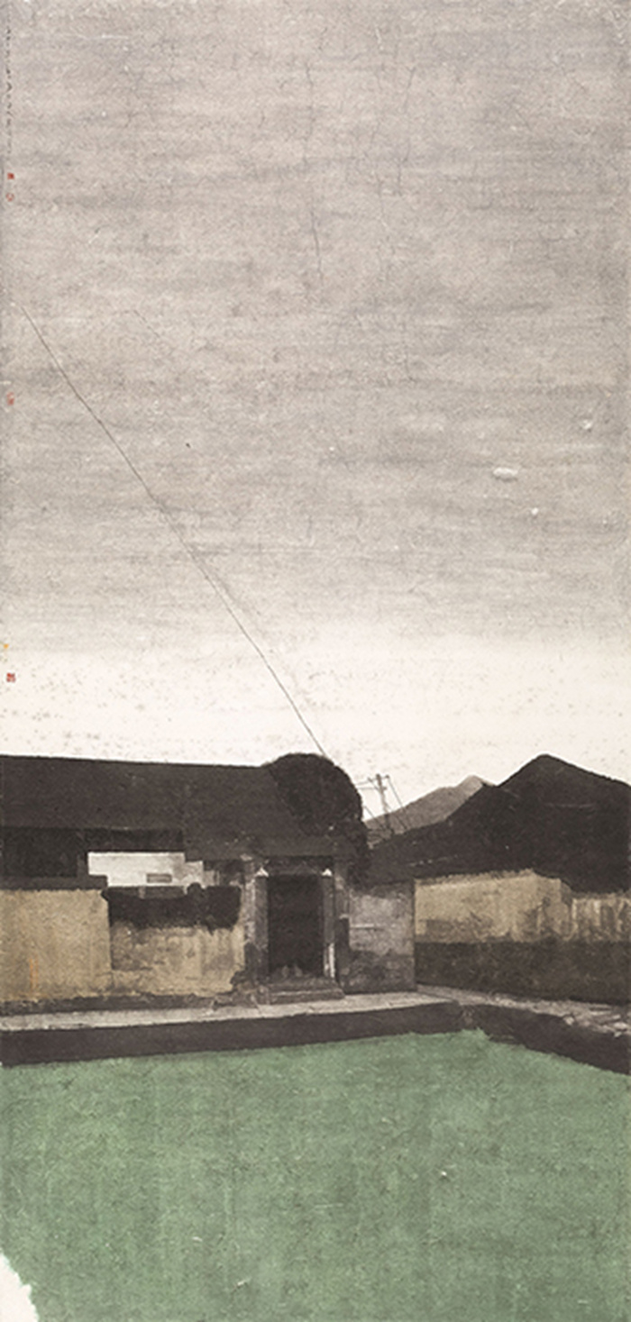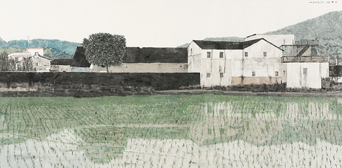 在古代山水畫中,村落通常只是山巒與林木之間的點綴,而在杜大愷的作品中,鄉村卻以中景和近景出現,成為畫面的主體。通過色塊的拼貼與墨韻的調和,甚至那些現實中略顯丑陋的現代房屋,也多了一份淳樸與和諧。正如《梅州行》系列,他先用線條勾勒房屋結構的疏密與節奏,再用淡墨或色彩加以渲染,構成體積與空間。他常常用淡墨來調和大面積的色彩,與局部的純色或留白的天空形成對比,傳遞出屬于中國山水那種雅致而沉靜的氣質。