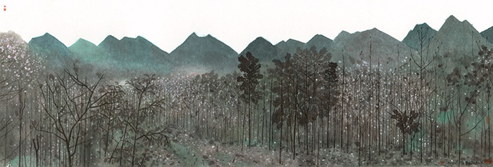 《匡山辛夷花開時》杜大愷 紙本水墨設色 61cm×400cm 2012年(圖片來源:清華大學藝術博物館)