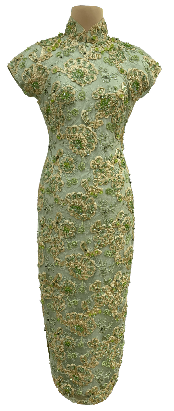 水綠地珠片絲帶繡花卉紋蕾絲旗袍