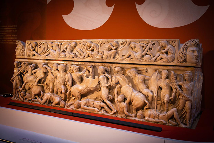 本次展覽展出的描繪亞馬遜女戰士與希臘人戰斗場景的石棺。(遼寧省博物館供圖)
