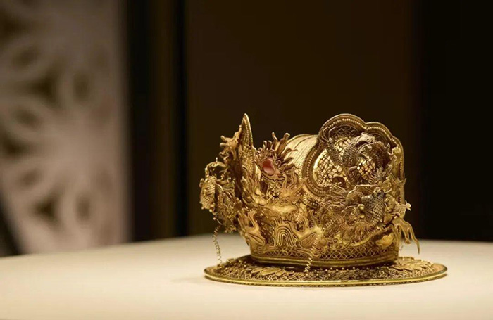 香港故宮文化博物館首件入藏文物“雙龍戲珠樑冠”首次亮相龍的頭部及火珠及火珠后方設有彈簧,佩戴行走時,龍頭及火珠會隨之搖動 ?香港故宮文化博物館