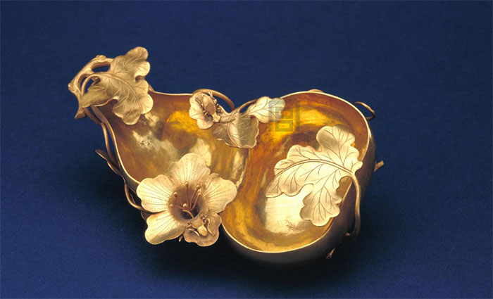 這件清代中晚期時的陳設用品八成金質,為剖開的半個葫蘆。器身外有葫蘆藤葉纏繞,并有盛開的花朵,花瓣上有昆蟲趴臥。做工極其精致而富有巧思,一洗金器的霸氣張揚,呈現出婉約俏麗的姿態。