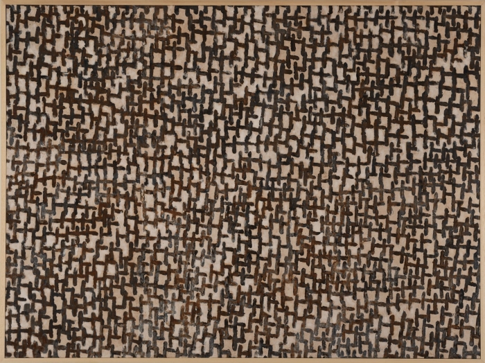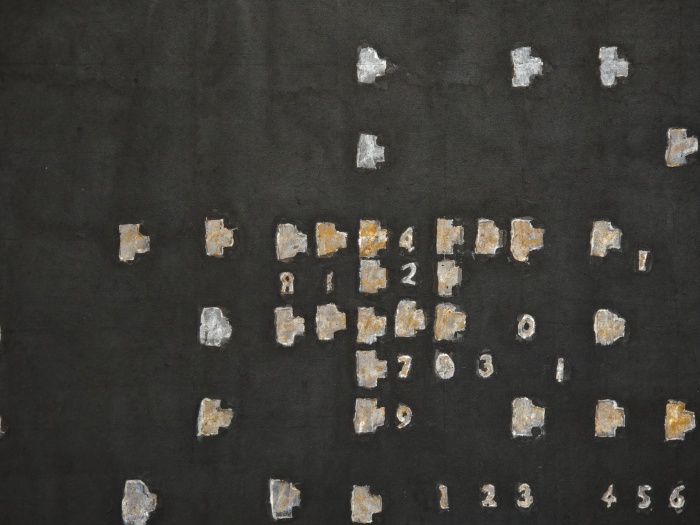 當然,藝術家需要警惕“圖解”。劉旭光說,“當代藝術最好的朋友就是哲學”,但話說回來,藝術與哲學不是主仆關系。劉旭光強調,藝術不是哲學,不是科學,也不是宗教,“藝術是人性中為自由提供空間的一種方式”。感性是藝術不可或缺的一部分?!安贰笔亲詈唵沃苯拥囊粋€古老符號,也具有某種本質屬性,兩條線段相互垂直,暗示兩種方向,兩種性質,又延展為“凸”形的塊狀符號。它們在平面上蔓延,時隱時現,整齊而有韻律,與巴赫的平均律樂曲相通,也可以是一種“摩爾斯電碼”。作品中的“黑”是豐富的灰色,就像看一場黑白無聲電影,能讓你的感官充分打開。