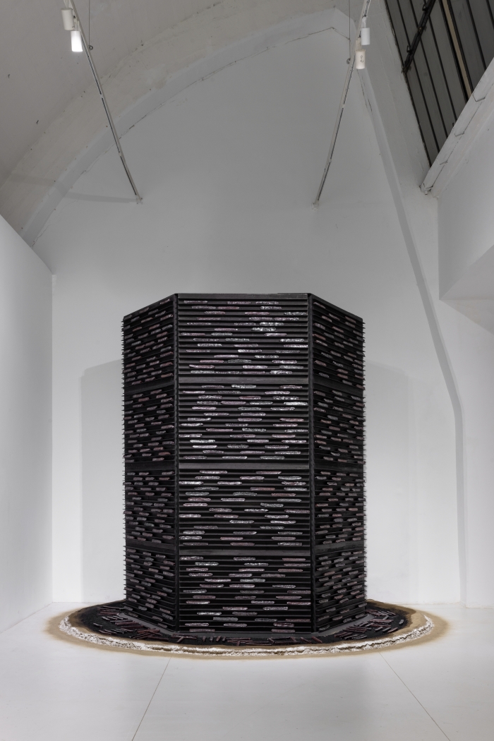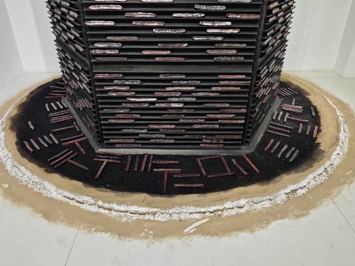 劉旭光 墨塔 2025年 高360×400cm 裝置:木材、瓷條、墨、黃河沙土等(圖片來源:東京畫廊+BTAP)