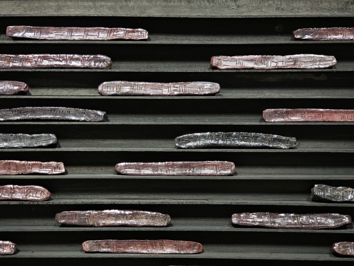 而《墨塔》也是以儀式的方式對數理關系、哲學問題的探討。這個裝置有四層,六邊形,四加六是十,重新歸零。架上和周圍的瓷條用算籌的排列方法記錄展覽開幕的日期,每個瓷條單拿出來就是“一”。仔細看,每個瓷條中依然有刻畫的數字,記錄了制作的時間,就像物質被無限分割,果核中也有宇宙。它既是時間的塔,也是生命的塔。
