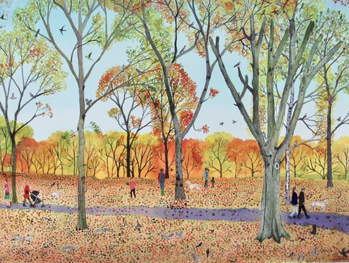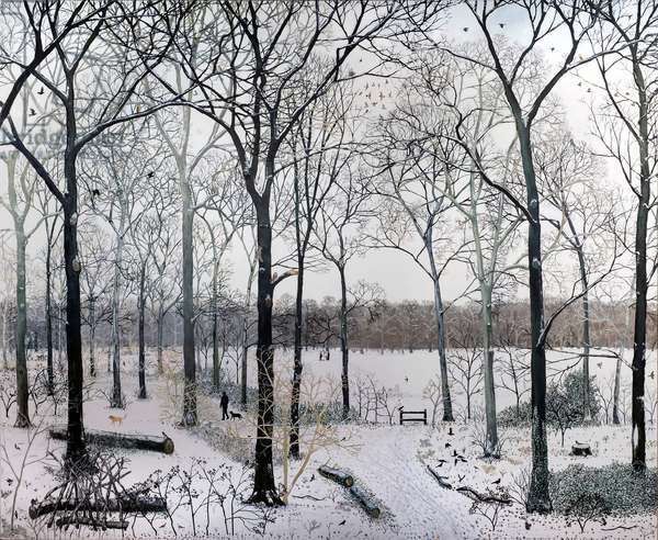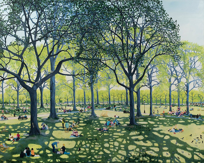 艾瑪?哈沃思(Emma Haworth)的創作建立在對現代都市生活的起起落落的細致觀察之上:在街道、公園、倫敦、紐約、巴黎或其他大城市中心的廣場。哈沃思既提煉出生動活潑的個別細節——冬天樹枝上掛著的塑料袋、海德公園日光浴者的纖細公文包——也提煉出對整個全景的重要感覺——穿過倫敦梧桐樹或從紐約摩天大樓反射的光線質量、人群中的運動感、銀行假日的愉悅感。哈沃思對四季樹木的感受和刻畫細致入微,春日咤紫嫣紅,夏日遮天綠蔭,秋日層林盡染,冬日冷枝立雪的一幅幅景觀在她的筆下栩栩如生?!缎瞧谌仗┪钍繄蟆返母ヌm克?惠特福德將她的作品比作中世紀晚期、文藝復興早期的作品,特別是勃魯蓋爾的《雪中獵人》。