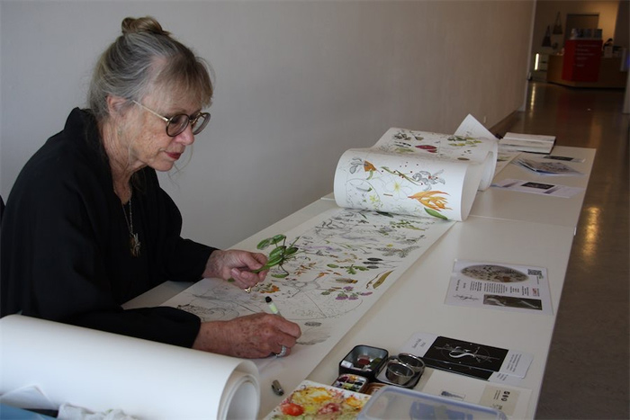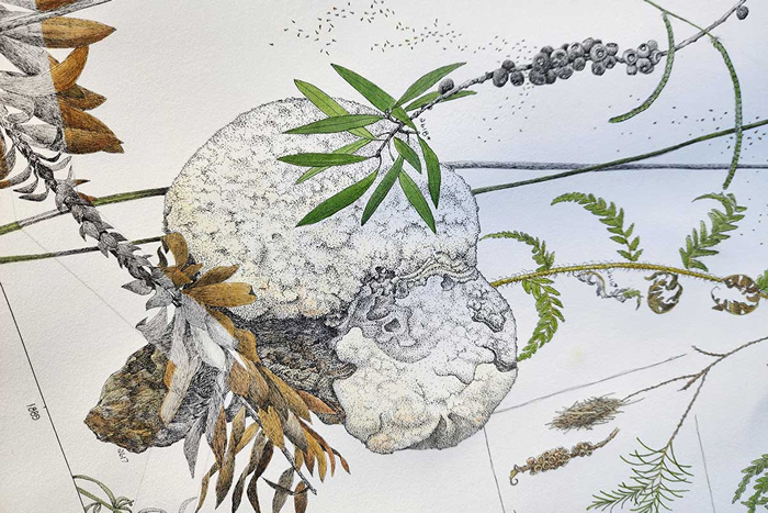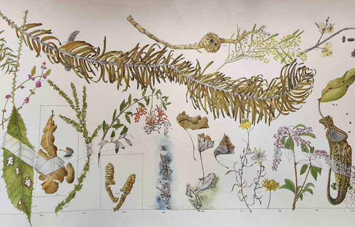 2022年,植物藝術家莎倫?菲爾德(Sharon Field)知曉了一則消息:到2030年人類如果不能將地球的氣溫升幅控制在 1.5 攝氏度以下,大量野生動物將面臨滅絕的風險。莎倫意識到此時距離2030年只有3000天,留給自己改變世界的時間已經不多了。她給自己設定了一個使命,即在2030年之前每天畫一株植物、動物或物體,積極應對氣候變化的影響。莎倫利用八米長的卷軸作為媒介,她說自己的作品有點像氣候變化的時間表。她的筆具有“檔案墨水”的永久性,這意味著它可以永遠被時間書寫。莎倫的繪畫從一小時到數小時不等,她沒有為卷軸上每幅畫的大小或位置制定計劃?!拔覠o法提前思考,”她說?!叭绻闼伎即笞匀?,大自然非常聰明,只需將事物組合在一起,一切就都成功了?!?/p>