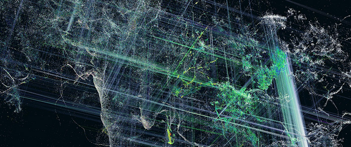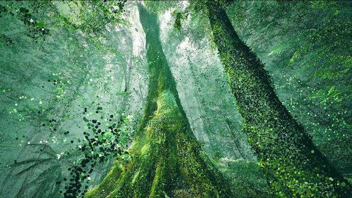 法國導演兼視覺藝術家亞歷克斯?勒吉盧(Alex Le Guillou)的最新力作《巨人-點云動畫》以數字藝術解構自然生態。該作品通過地面與無人機雙重視角采集的激光雷達數據,對澳大利亞塔斯馬尼亞原始森林中的參天古樹進行三維建模,以實時創作工具Notch與Unreal Engine構建動態視覺系統,多維詮釋巨樹生態的生長軌跡、信息傳遞、生態互聯、共生保護與水循環系統。這些片段被插入紀錄片中的真實片段中,展示出森林生態的全新認知維度。