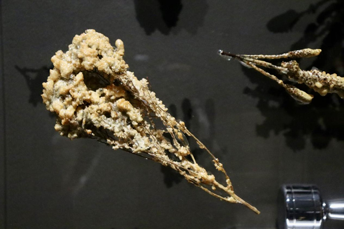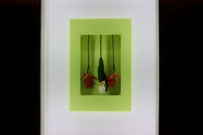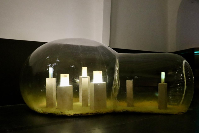 在展廳的深處,《給GG的出租車先生》(2012/2025)的新版本格外引人注目。這件作品最初創作于2012年,是藝術家早期探索氣味與記憶關系的代表作。此次在UCCA的呈現中,藝術家對作品進行了重要更新:原有的天婦羅炸花裝置被置于特制的恒溫玻璃容器中,通過精確控制的環境系統,使有機材料在展期內產生微妙的變化。這種對易逝材料的運用,體現了藝術家對生命脆弱性的持續關注。