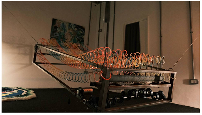 這張由彈簧玩具、鐵架、電機和機械結構組成的“床”是整個空間中的核心裝置 - 它看起來既熟悉又讓人感到不安,源于王豆豆當時對“safe space”這個概念的關注。生活的變故讓她開始渴望一個可以安放情緒和身體的地方,但現實中這份需求始終無法被滿足,她通過建立一個象征性的空間,還原一個不穩定但依然存在的“避風港”,并在其過程中思考“玩樂”與“游戲機制”的邊界問題。床在大多數人心中是休息、睡眠與親密的象征,是最柔軟、最私密的場所,豆豆選擇工業質感極強的材料來反構這一印象。并使用彩色彈簧玩具代替真實彈簧,它們既保留了“床”的彈性結構,又引入了某種關于童年游戲的輕盈和荒謬。