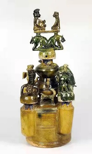 它的結構繁復,形式獨特,底部是碩大的谷倉罐,倉體上耳附著四個外連內通的敞口小倉。一大四小五個倉口上面,疊堆著形態各異的人物、走獸、飛禽等堆塑,層層疊疊,錯落有致,既可組合,又可脫卸。最上面是正襟危坐的一大一小倆人物,神態可掬,惟妙惟肖……