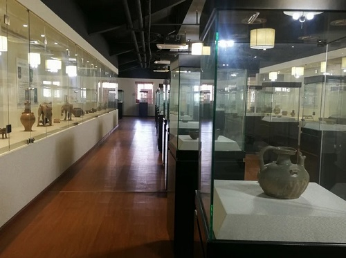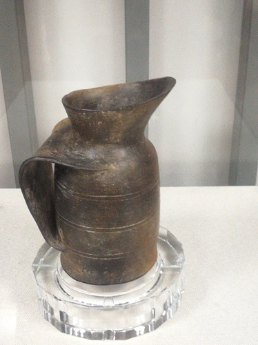 墻角轉彎處的展柜里有一把黑陶闊把壺,瓷實細密,線條豐滿,像一只形態可掬的企鵝。它腆著胖胖的肚子,昂首踮足,紳士般地面對游客作深思狀。這把壺是來自良渚文化的原始陶,是新石器時代的杰作,有四五千年的高齡古陶,與同居一室的眾多青瓷晚輩,可謂是德高望重的長者。如今,這只“老妖精”靜靜地佇立在命運的拐彎處,似乎還沉浸在回憶里,懷念“良渚古城”,懷念被考古專家定義為“中華第一城”的輝煌過往。
