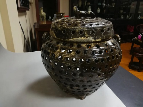 一只香薰爐的故事,就是一部離奇的《捉妖記》。許多年前,他在紹興東關古玩地攤上看到一只缺了蓋子的香薰爐,一見是“老東西”,果斷地把它“捉”回了家。幾年后,他出差北京,在潘家園古玩地攤上發現一只香薰爐蓋子,一見是“老東西”,又把它“捉”回來,然后鎖進倉庫,打入冷宮。事隔數年后,整理倉庫時才發現這兩個“老東西”竟然是一對原配!經專家鑒定,其釉色、弦紋、鏤孔的大小和制作手法,絕對出自一人之手。此時此刻,他驚呆了,這個來自東漢越窯青瓷鏤空香薰爐,將近兩千年來,是如何南北兩地“身首”分離?其間有多少不為人知的散佚故事?冥冥之中又是如何千里迢迢離奇團聚?回憶那次北京之行,他心里總有一種異樣的感覺:穿行在熙熙攘攘的古玩市場,面對琳瑯滿目的古董寶貝,一反常態地對其它器物沒有下手,單單捧著這只“破蓋”千里迢迢地回來,顯得太不可思議了。