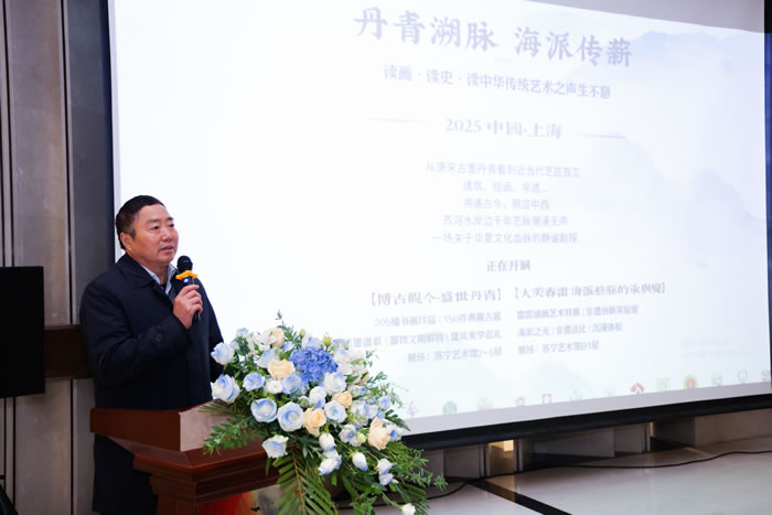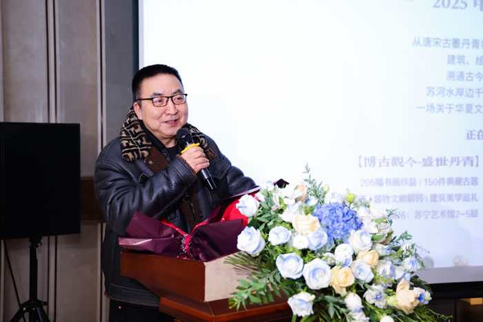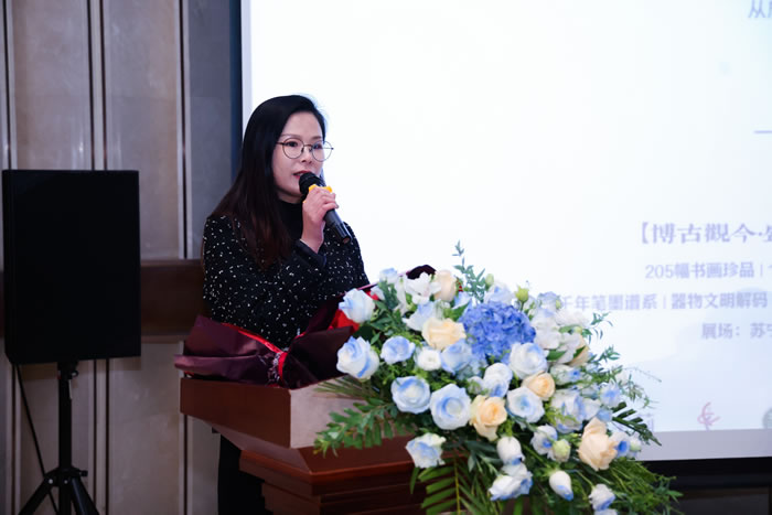 蘇寧藝術館輪值代理館長張磊致辭祝賀,介紹蘇寧藝術館建館歷程與全新主展內容《博古觀今,盛世丹青》