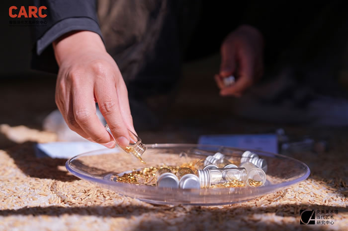 “畢竟是滄海一粟,其實我真正希望看到的,是人們可以放棄金米的誘惑,而通過這一互動本身思考和找到自己心中真正的‘金礦’。”藝術家坦言,“作品的成敗不在于黃金是否被找到,而在于人們是否重新凝視手中最普通的大米?!泵课挥^眾離場前可以將普通大米放入玻璃瓶珍藏,這一行為被藝術家定義為“對消費主義的精神叛逃”——當黃金成為欲望的誘餌,拾起大米即是對生命本質的樸素回歸。